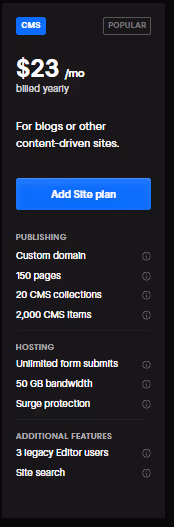 The Webflow CMS plan offers a full-featured content management system with dynamic templates. It unlocks collection lists, blog-style content workflows, and editor access.