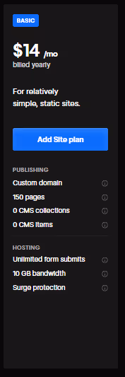 Basic Webflow site plan at $14/month, includes 150 pages, 10GB bandwidth, and a custom domain.