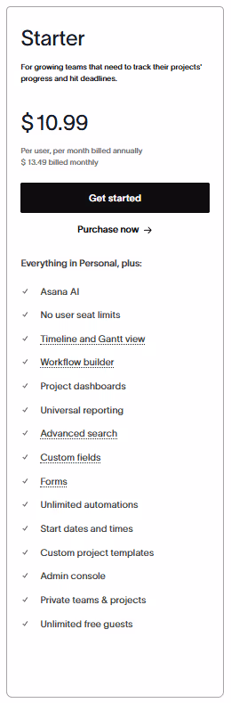 Asana Starter plan at $10.99/month adds timeline views, workflow builder, custom fields, forms, advanced search, and automations with no user cap.