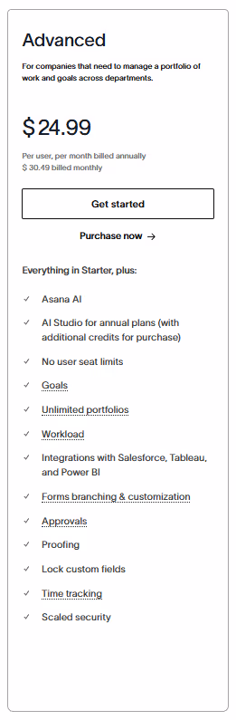 Advanced plan at $24.99/month includes AI Studio access, portfolios, workload tracking, time tracking, approvals, Salesforce integrations, and higher usage limits.