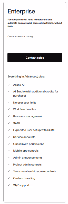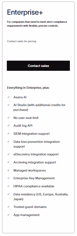 The Enterprise plan unlocks full control, unlimited automation, and high-security features. It’s designed for organizations with strict requirements and large user bases. Asana prices at an enterprise level depend on volume and requirements.