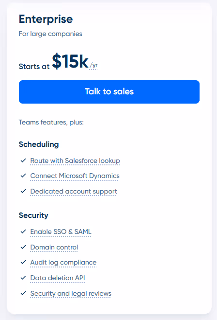 Calendly Enterprise plan starting at $15,000/year adds Salesforce lookup, Microsoft Dynamics integration, SSO/SAML, audit logs, and dedicated account support.