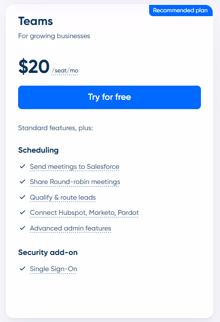 Calendly Teams plan at $20/month per seat includes lead routing, round-robin scheduling, CRM integrations, and advanced admin features, with optional SSO.