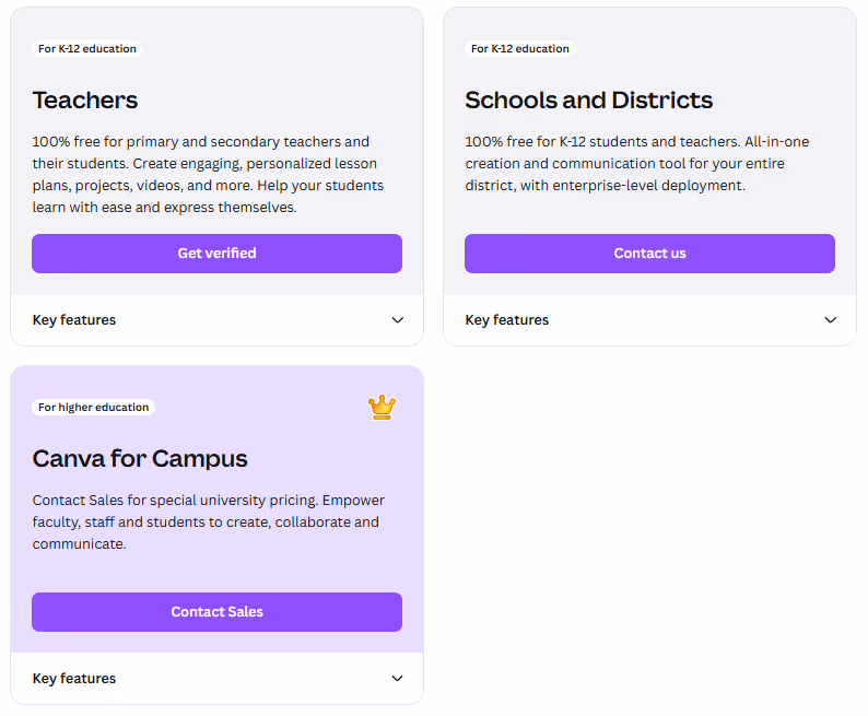 Canva offers free tools for K–12 teachers and districts, plus custom pricing for higher education via Canva for Campus.