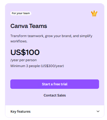 Canva Pro costs $120 per year for a single user, while Canva for Teams starts at $300 per year (because of their 3-user minimum condition).