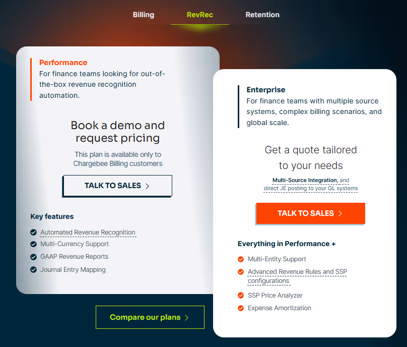 The image highlights Chargebee’s RevRec Performance plan with features like automated revenue recognition and GAAP reporting (available to Billing users only), and the Enterprise plan offering multi-source integration and advanced SSP configurations.