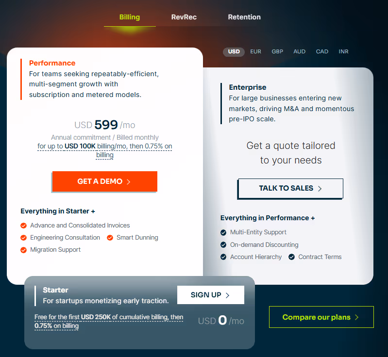 At this level, you gain access to consolidated invoicing, smart dunning workflows, custom domain support, and multiple payment gateway integrations. You also get engineering consultation and migration support, which aren’t available on the Starter plan.
