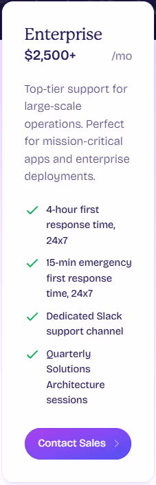 Better support with faster response times, dedicated Slack access, and quarterly architecture reviews for scaling apps.