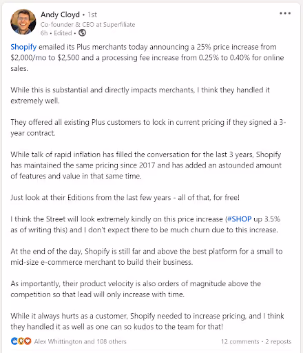 Shopify Plus has also recently raised their pricing, but they were met with praise for the approach they took. Even though they were raising their prices by a whopping 25%, they offered legacy pricing for merchants willing to sign a three-year contract.