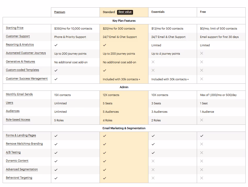 Mailchimp pricing comparison chart showing Premium, Standard, Essentials, and Free plans by feature access, support level, email volume, users, audiences, and marketing tools.