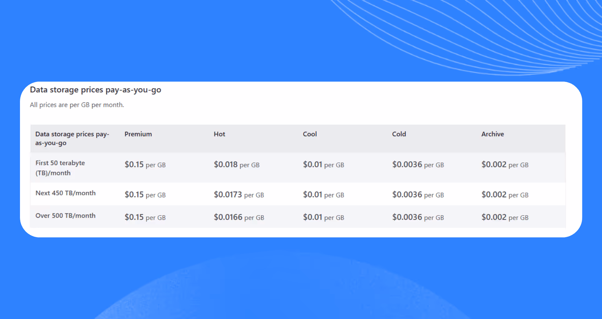 Azure Blob Storage follows a pay-per-use cloud billing model. Customers pay for what they store, retrieve, or delete, down to the byte. Like AWS, Azure’s pay-as-you-go pricing system is highly granular and caters to dynamic storage demands across industries.