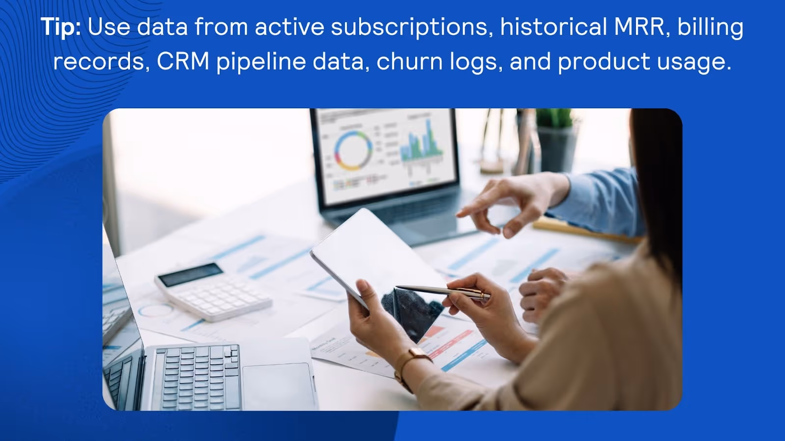 Set up systems to update your forecast automatically with the latest data. For example, connect your billing platform via API to pull updated MRR and churn logs. Set a cadence (weekly or monthly) for refreshing the forecast based on new usage, pipeline, or customer activity.