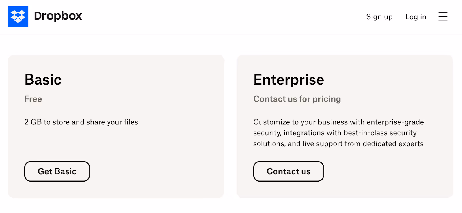Dropbox is targeted at individual users and small teams with their free Basic package. They understand that casual users may not pay for the service upfront, but continued engagement with the product could lead to upselling opportunities.
