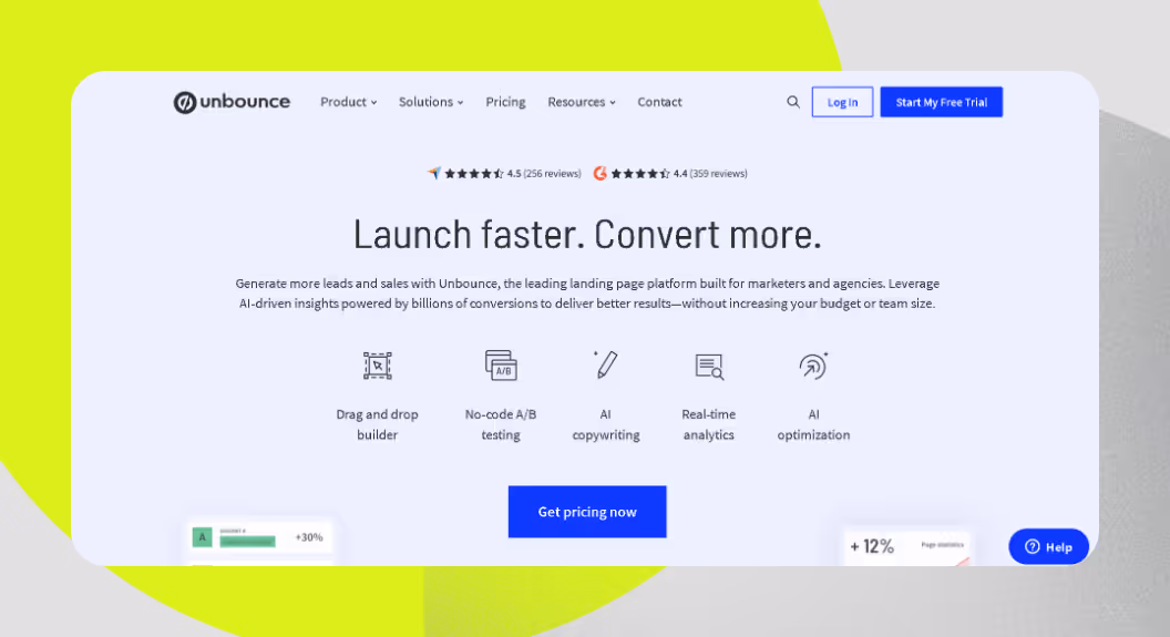 - Build: This tier includes core features like a drag-and-drop builder, templates, and basic integrations, which make it easy to create and launch professional-looking landing pages.