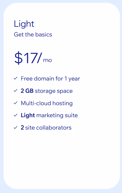 Wix Light plan costs $17/month and includes 2 GB storage, a free domain for one year, multi-cloud hosting, a light marketing suite, and support for 2 collaborators.