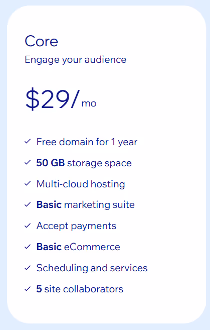 Wix Core plan at $29/month offers 50 GB storage, basic e-commerce features, payment processing, and scheduling, plus 5 site collaborators and a basic marketing suite.