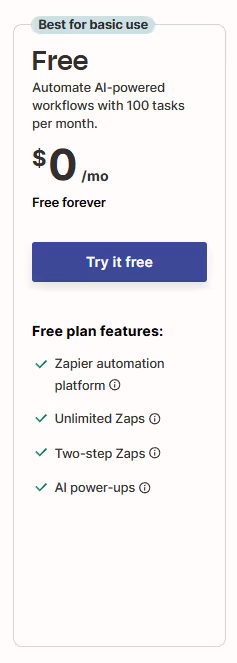 The Zapier Free tier features 100 tasks/month, two-step Zaps, and AI features at no cost for individual users.