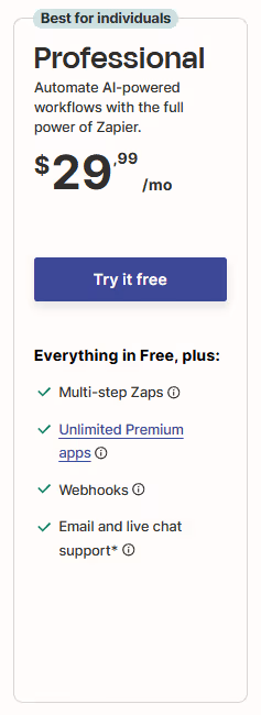Zapier Professional plan at $29.99/month includes multi-step Zaps, premium apps, webhooks, and live support.
