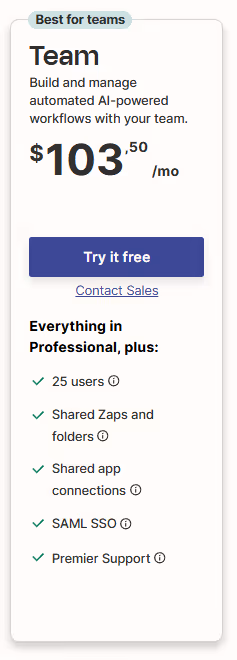 Zapier Team plan at $103.50/month includes 25 users, shared folders, SAML SSO, and Premier Support.
