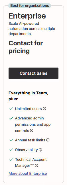 Enterprise plans offer custom setups for organizations that need automation at scale and deep control over users, data, and security.