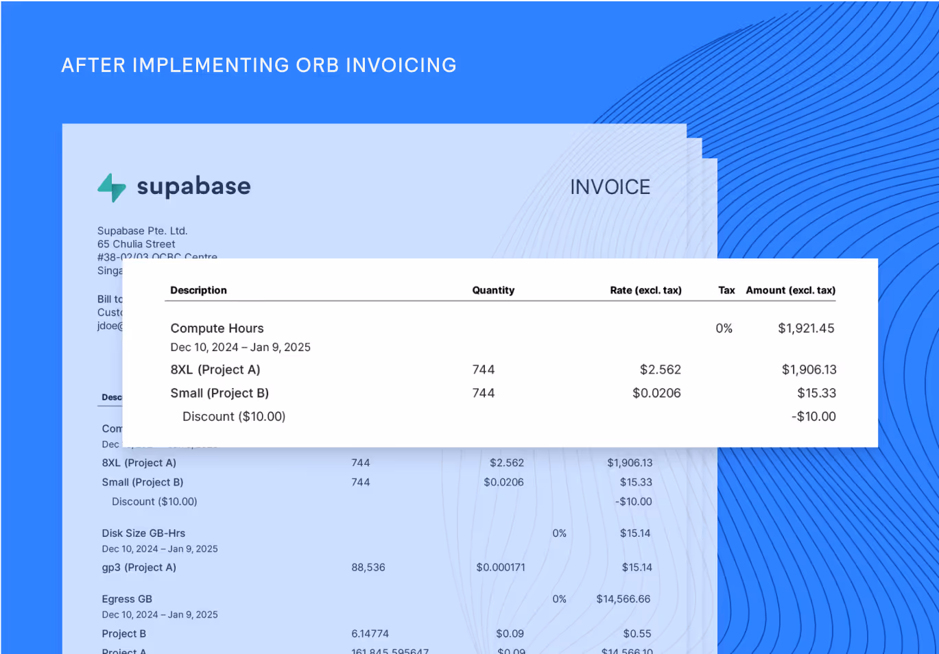 The switch to Orb’s invoicing system alone resulted in substantial savings, freeing up resources for further innovation and growth. Supabase now processes over 1.5 million invoices per month through Orb, benefiting from detailed, transparent invoices that reduce customer support inquiries and enhance user trust. Detailed invoices and real-time usage insights empower Supabase's customers with clear, predictable billing, aligning with the company's commitment to transparency.