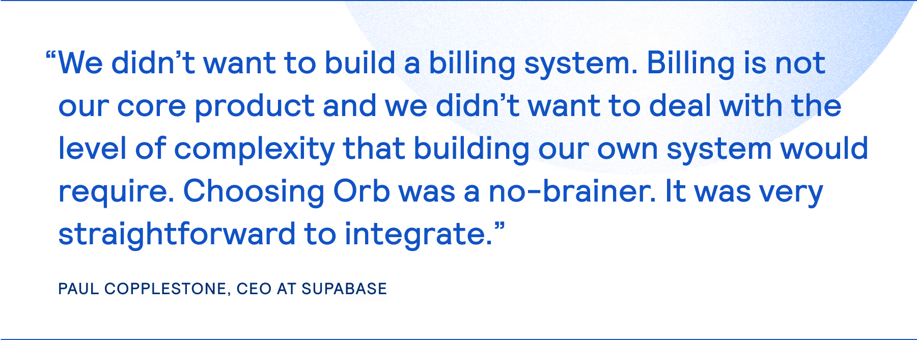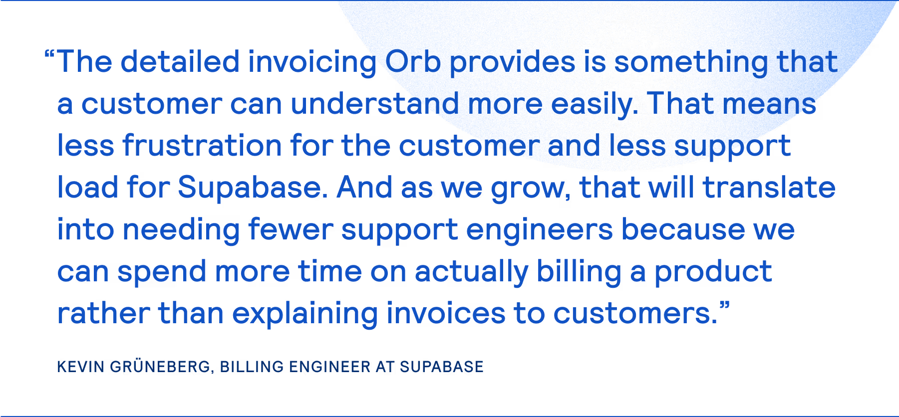 - Orb’s intuitive platform reduced the time and resources required to manage billing, allowing Supabase to focus on core business priorities and save on support costs.